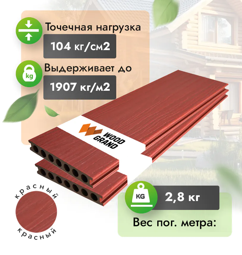 Наша террасная доска из ДПК выдерживает до 3318 кг/м2, влагостойкая, не требует ухода.